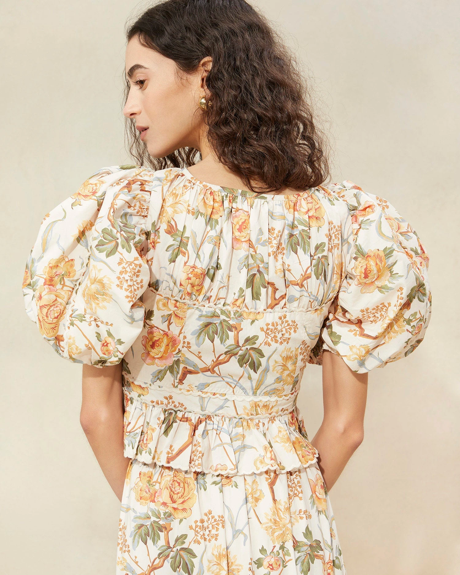 Peplum top in cream botanical floral poplin. Features puffy sleeves, scalloped detailing throughout, and a concealed side zipper.