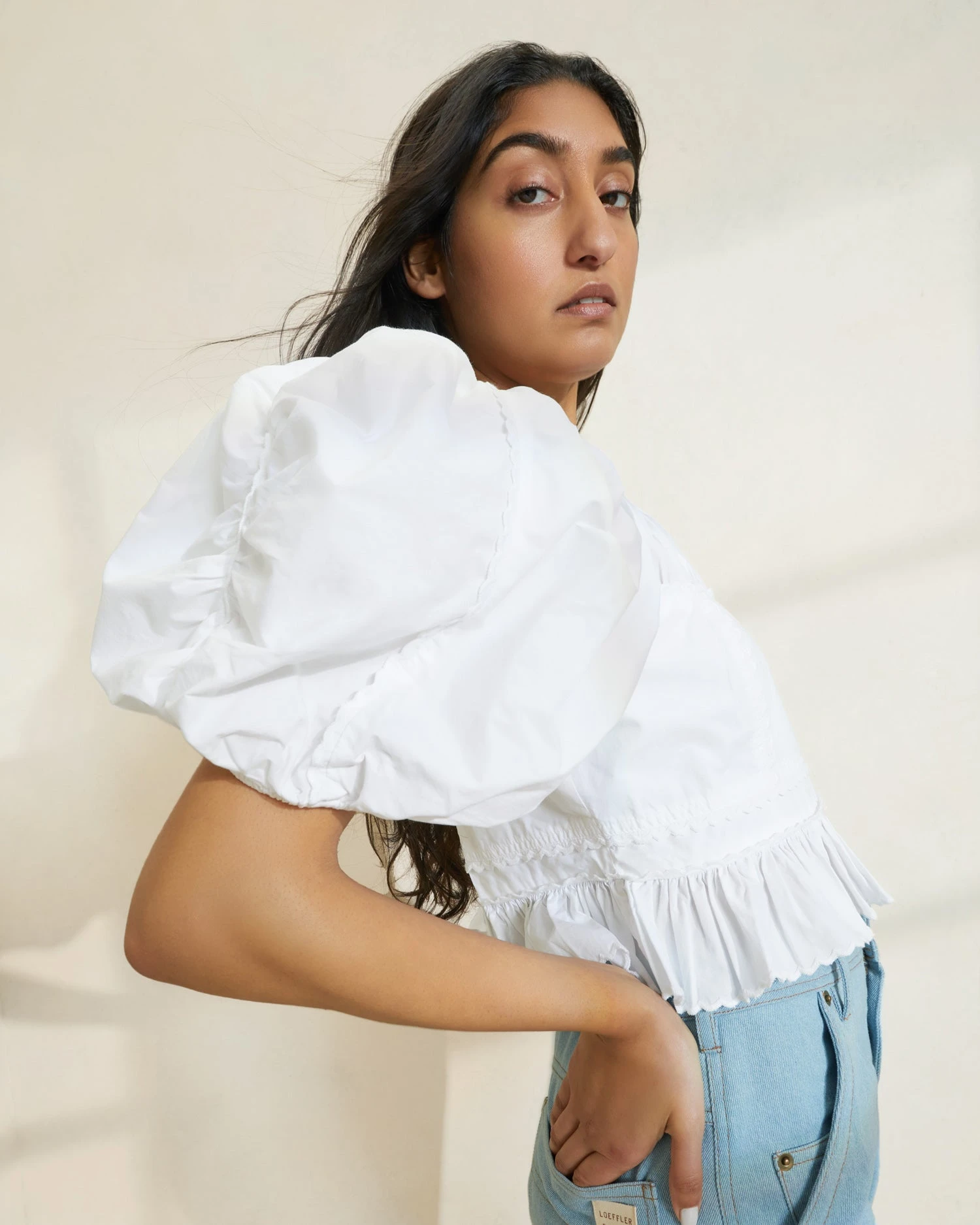 Peplum top in white poplin. Features puffy sleeves, scalloped detailing throughout, and a concealed side zipper.