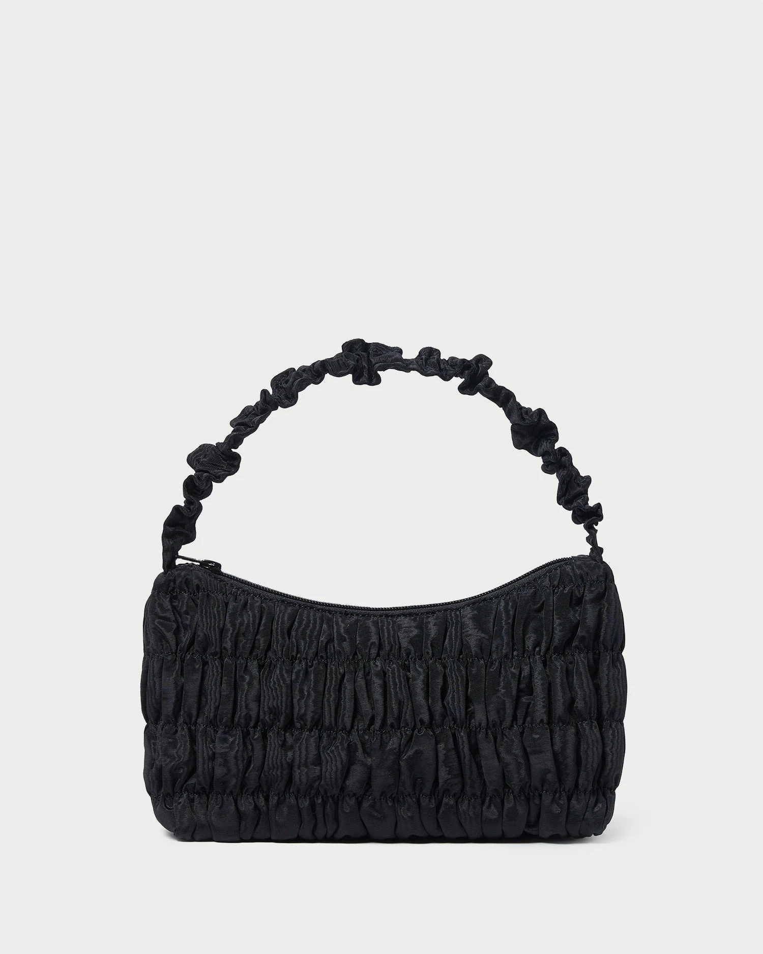 Shoulder bag in ruched black Italian moiré. Features a gathered strap, zipper closure, full lining, and gold stamped logo.