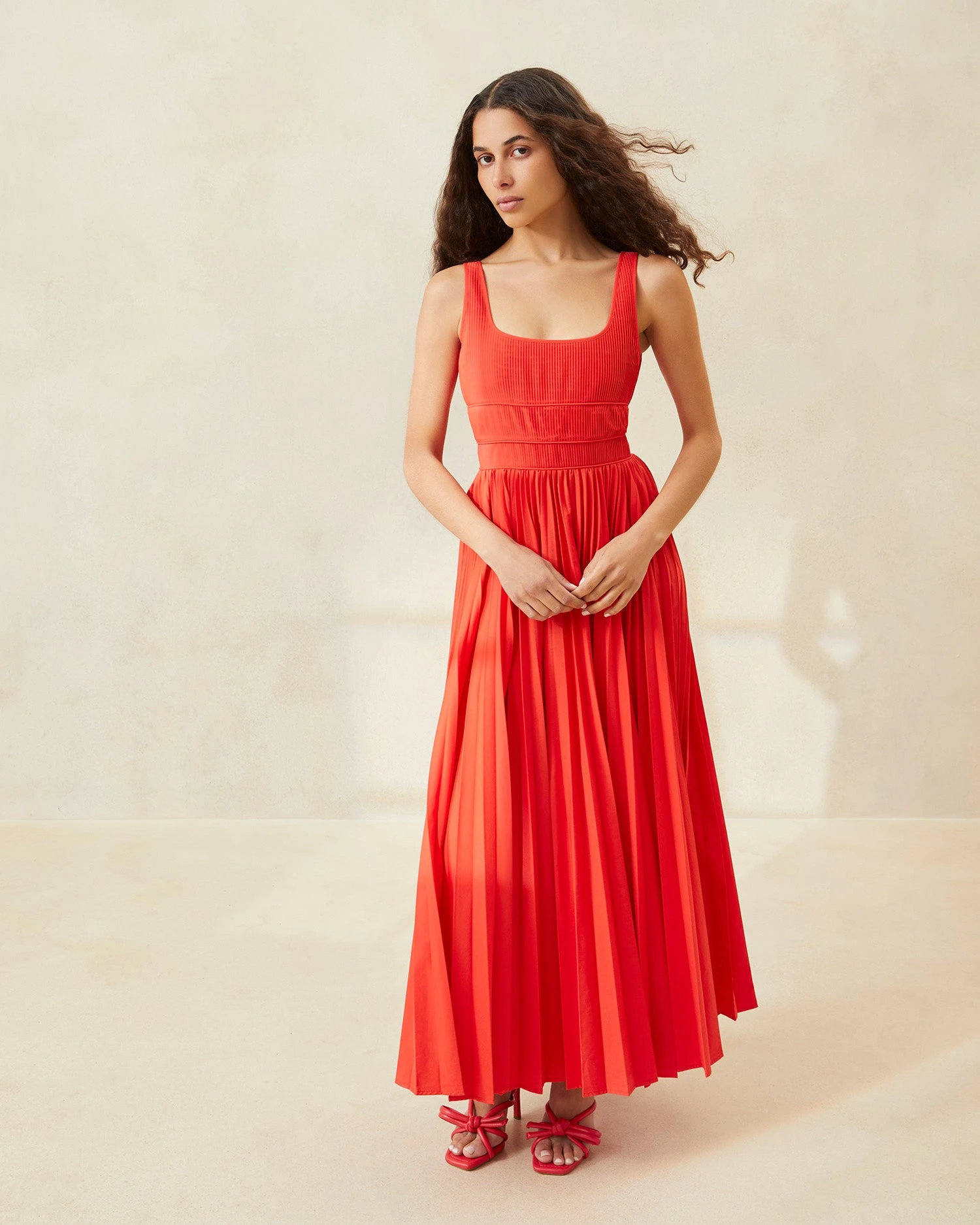 Mid-length accordion-pleated dress in a poppy red cotton-silk blend. Fitted at the bodice, this dress flows out at the hips for a flattering shape.