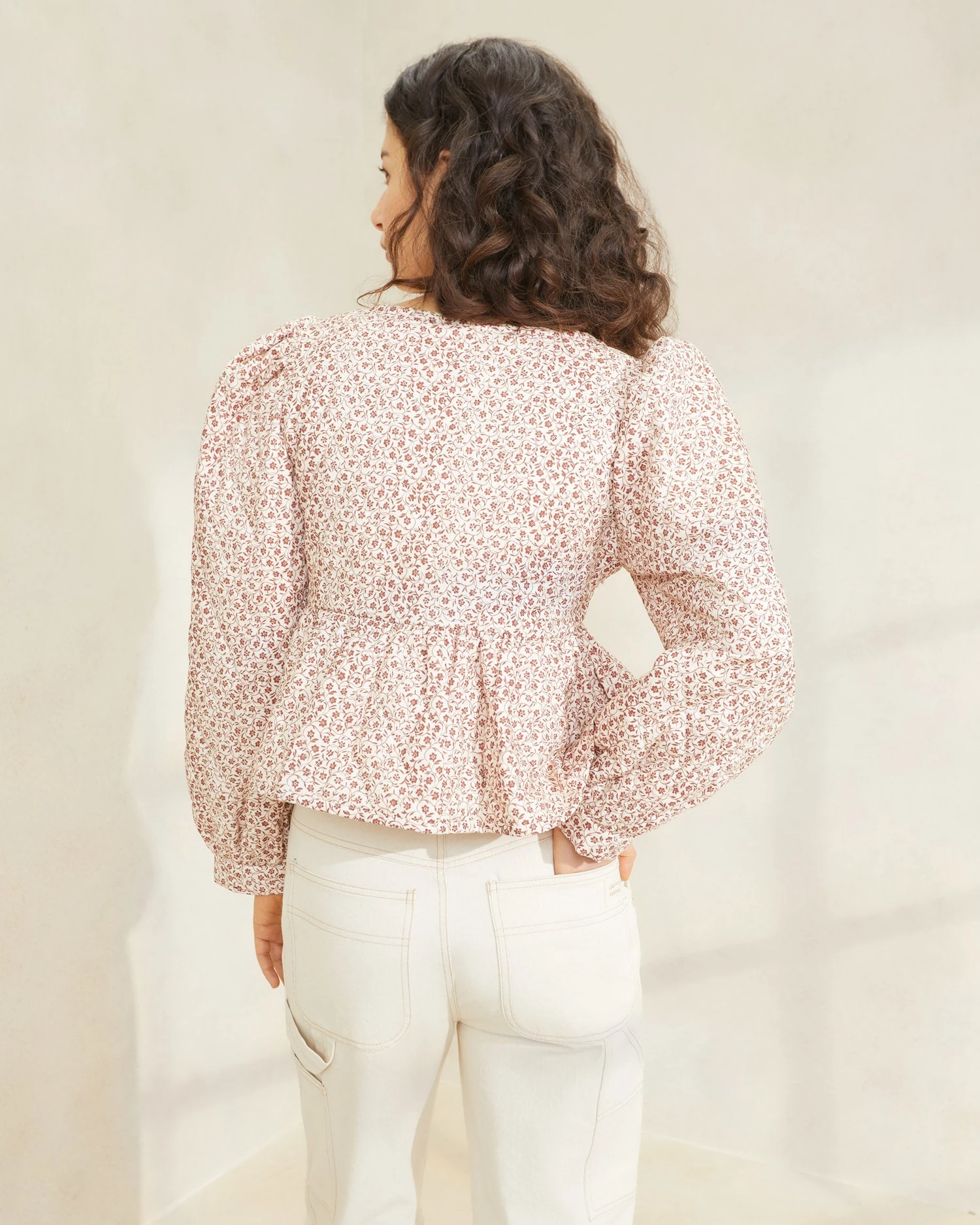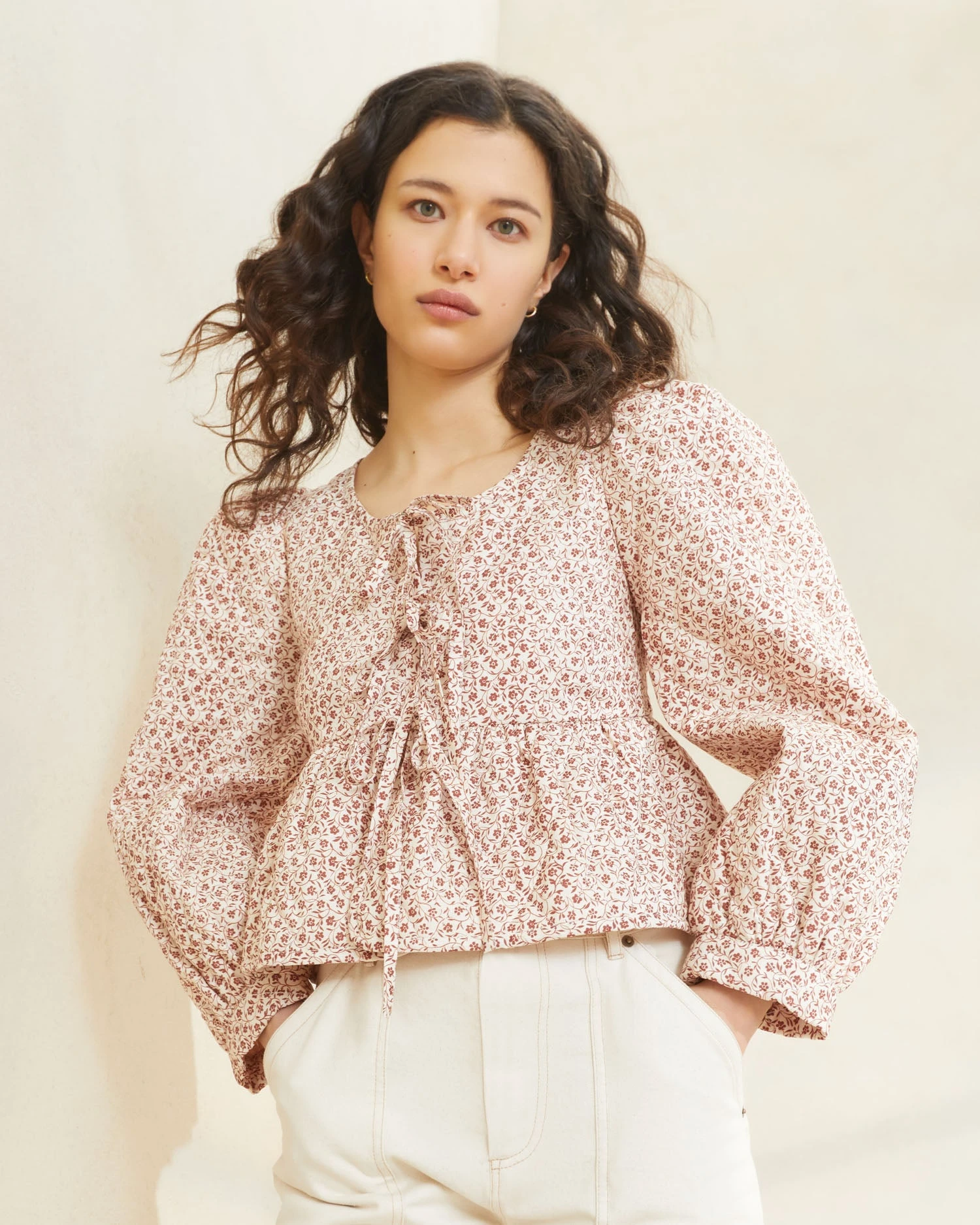 Lightweight jacket in cream and amber brown ditsy floral broadcloth. Features puffy sleeves, a ruffled peplum bottom, and a tie-front closure. Pairs beautifully with the matching Leigh skirt.