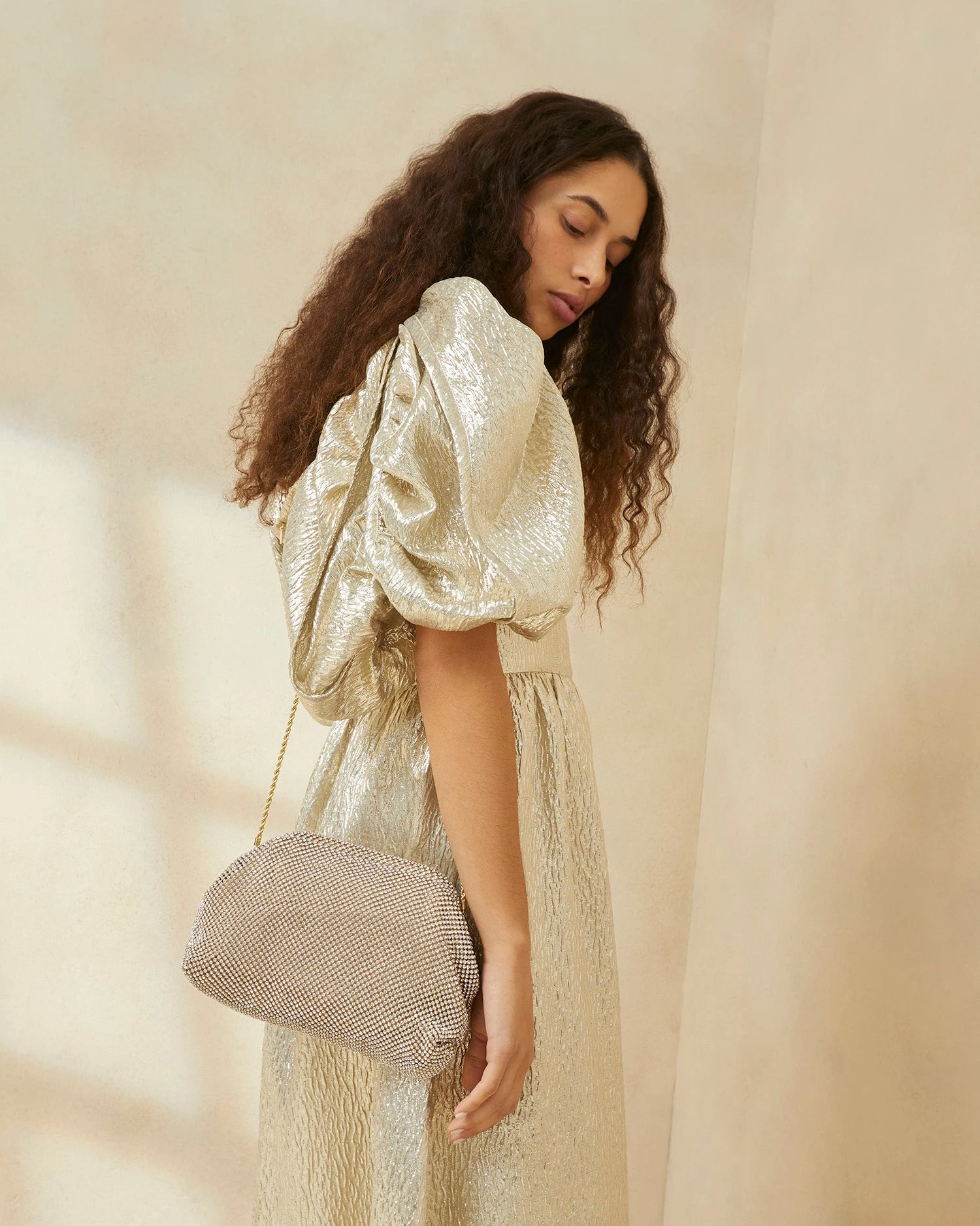 Frame pouch in gold diamanté. mesh. Features a removable twisted gold metal chain strap, frame closure, full lining, and an interior slip pocket.