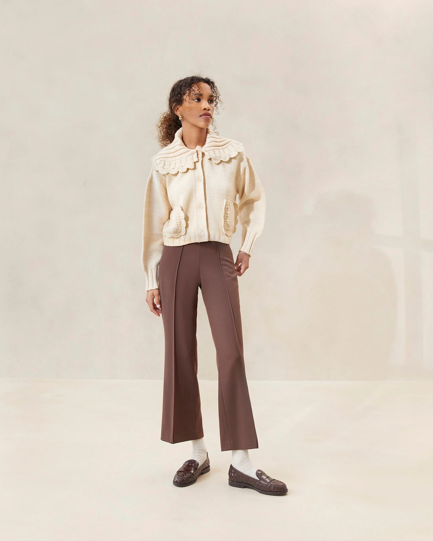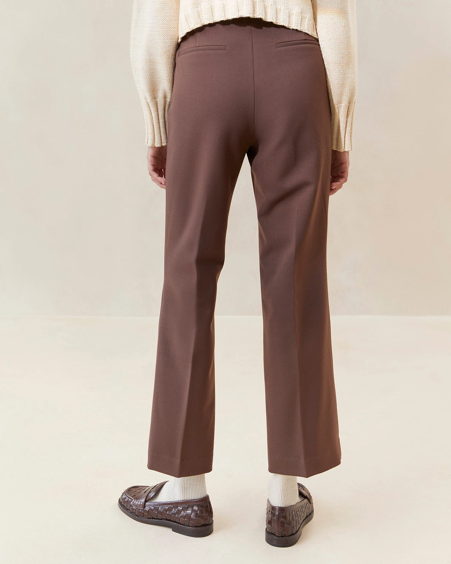 Straight-leg trousers in espresso brown stretch twill. Made in a thicker fabric with a bit of give, Jeanne is fitted through the leg with a kick flare at the hem. Features a zipper closure at the side.