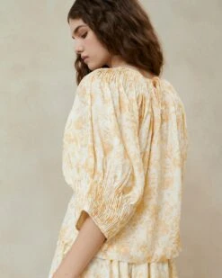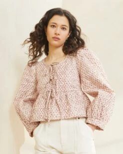 Oversized flowy dress in black and dark brown linen lace. Features puff sleeves, pockets, and light gathering at the rounded neckline. Closes with a tie detail at the back neck.