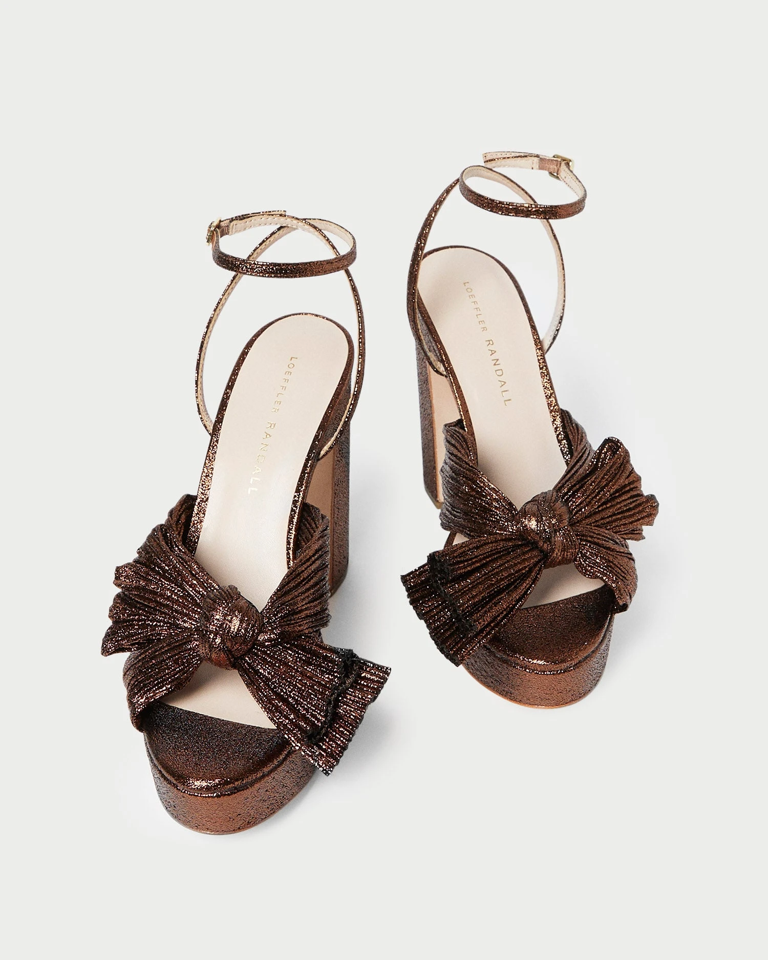 Pleated platform sandal in mocha brown lamé topped with our signature knotted bow. Features a padded leather footbed with gold stamped logo, an open toe, and an adjustable buckle ankle strap. 4.5-inch heel.