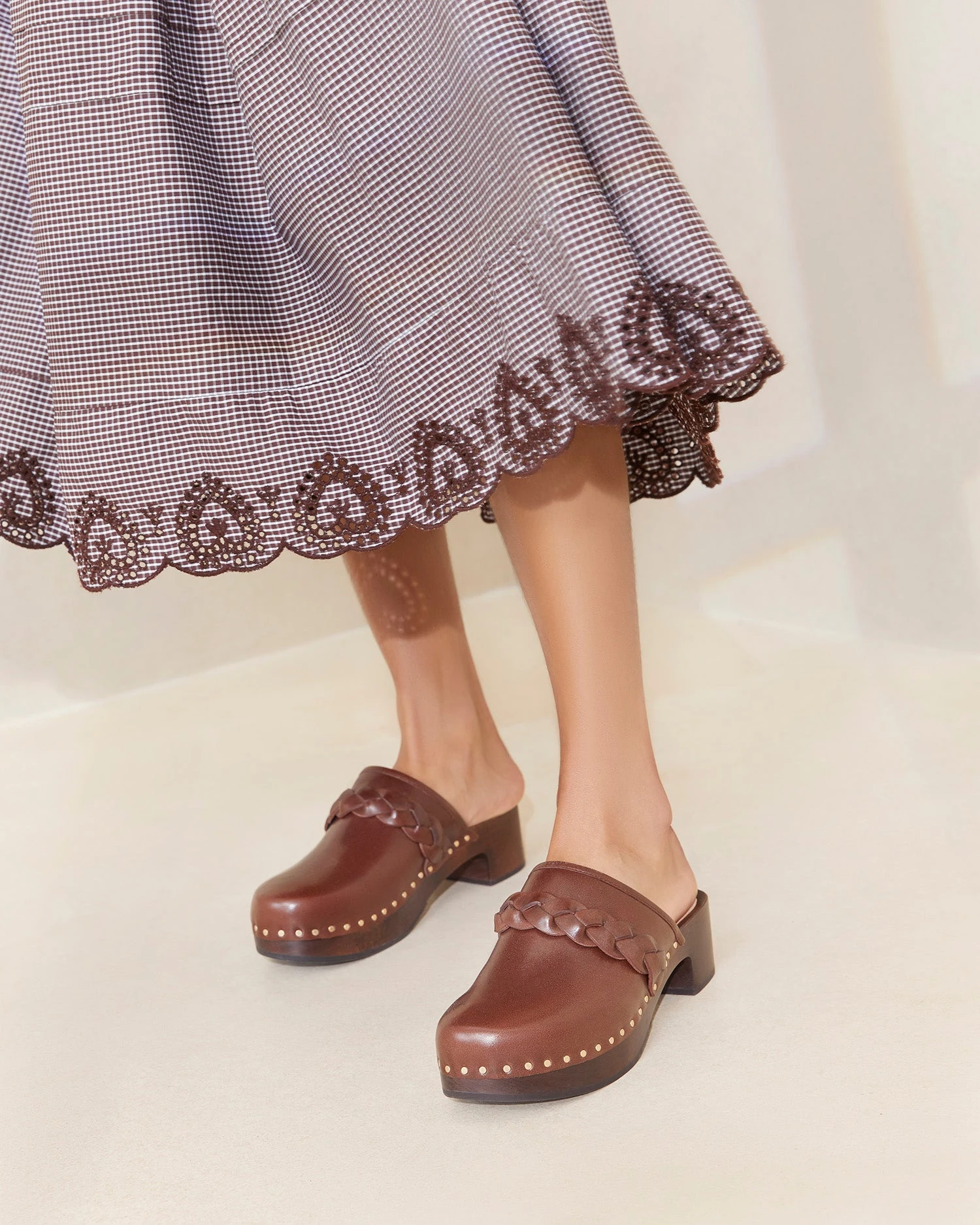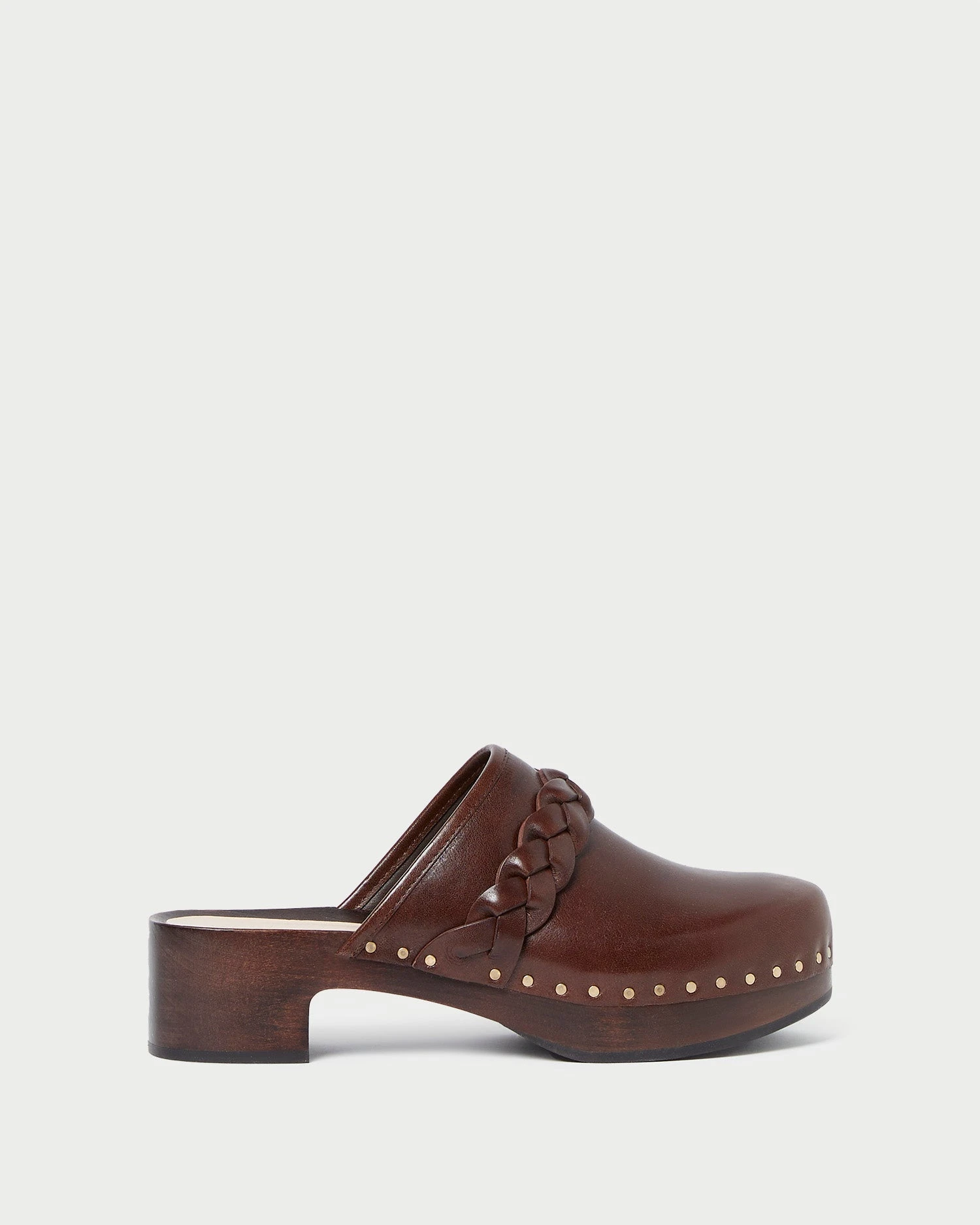 Low-heel clog in espresso Italian vachetta leather with braided detail and tonal sole. Features a padded insole, round toe, and slip-on construction. 2-inch heel.