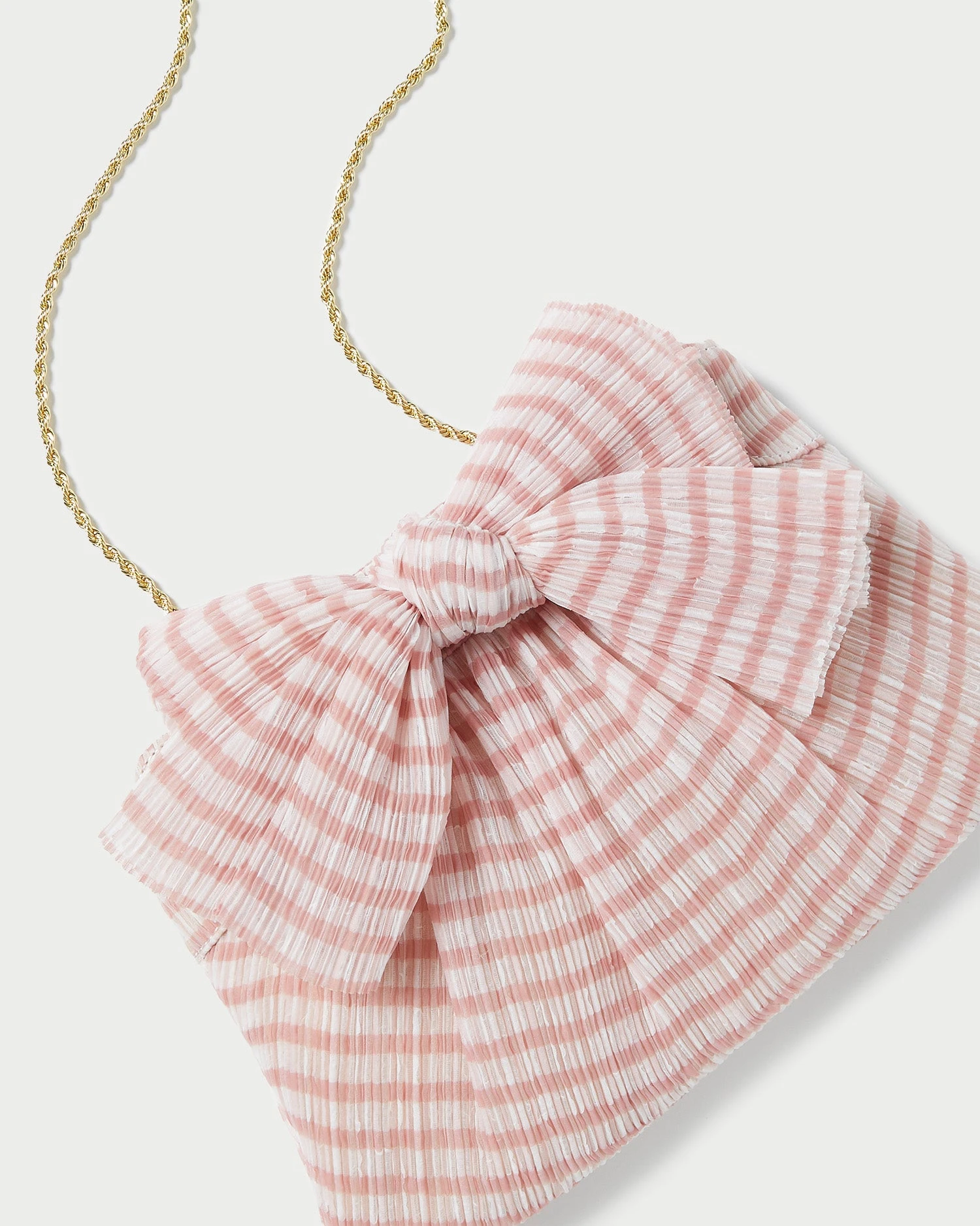 Pleated frame clutch in soft pink and white gingham-printed fabric topped with our signature knotted bow. Features a removable twisted gold chain crossbody strap, frame closure, full lining, and gold stamped logo.