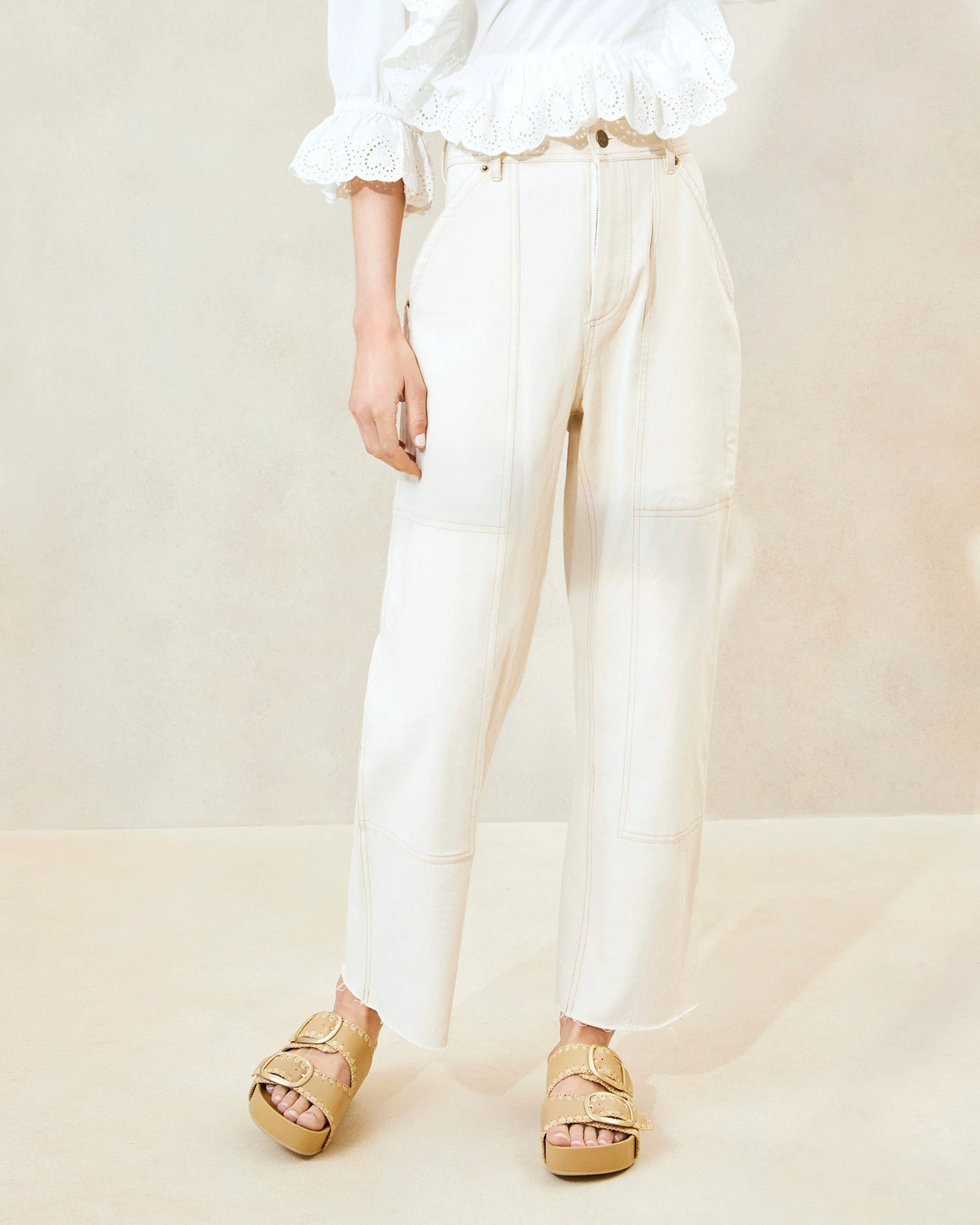 Cream-colored carpenter pants. Made in New York with a US-sourced fabric, Roy is a straight leg, raw hem pant complete with LR signature details.