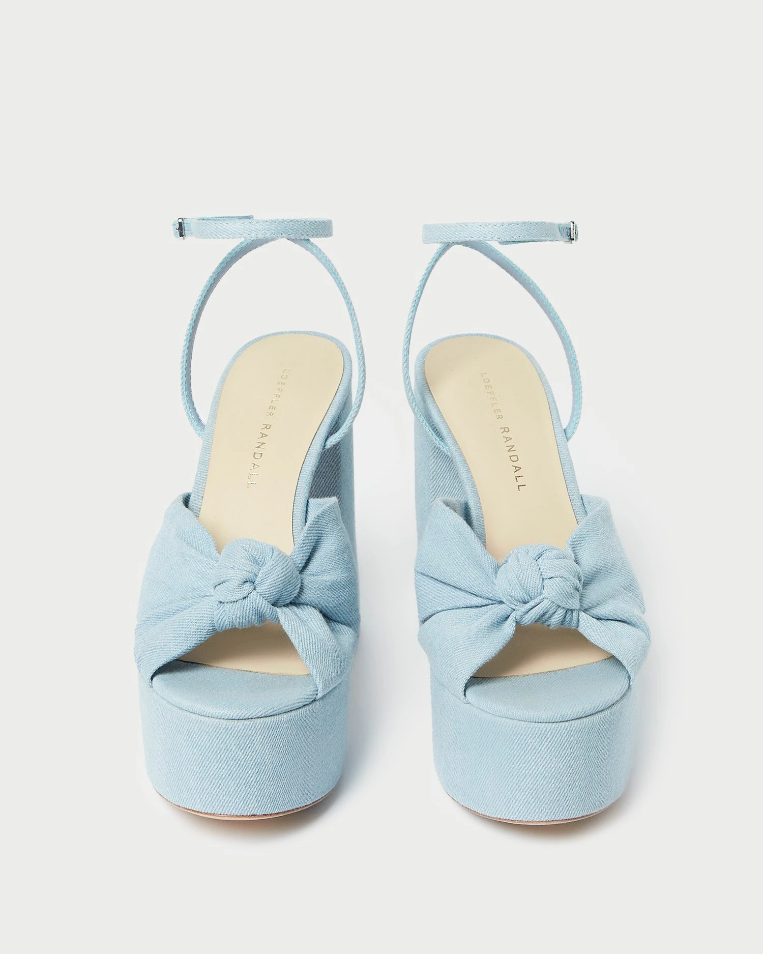 Knotted platform sandal in light blue USA-made denim. Features a leather footbed with a gold stamped logo, an open toe, and an adjustable buckle ankle strap. 4.75-inch heel, 2-inch platform.