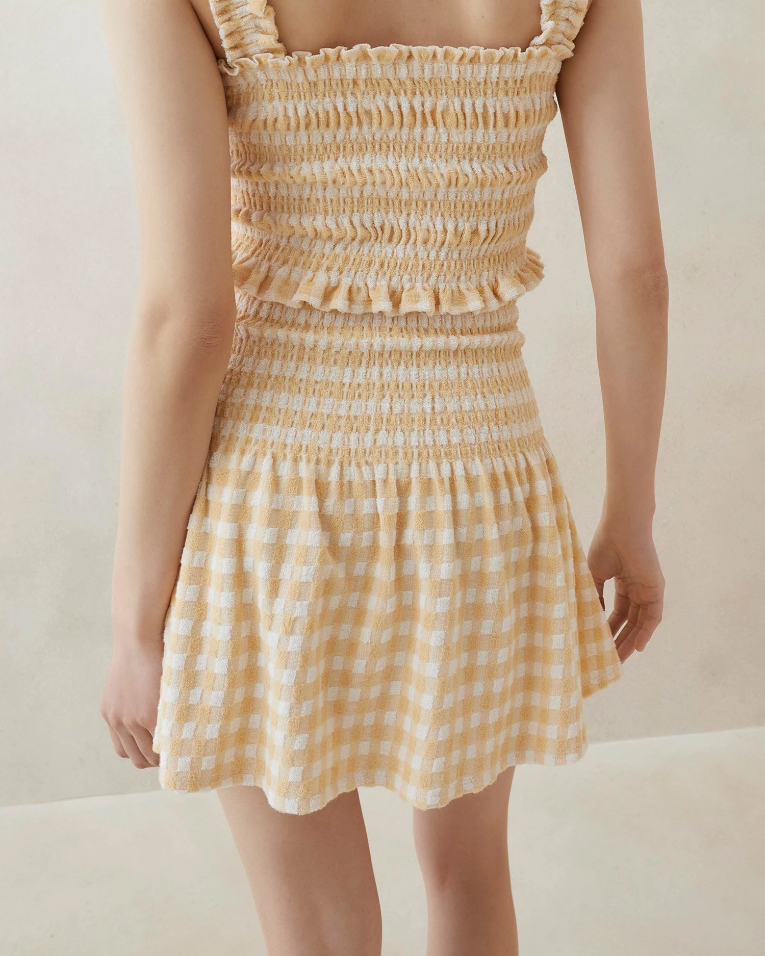 Smocked mini skirt in tan and cream gingham terrycloth featuring a drop waist construction.