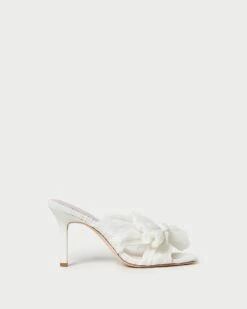 Pleated heeled sandal in pearl white fabric. Features a padded footbed, open toe, and lace-up closure. 3.5 inch heel. Made completely from vegan-friendly materials.