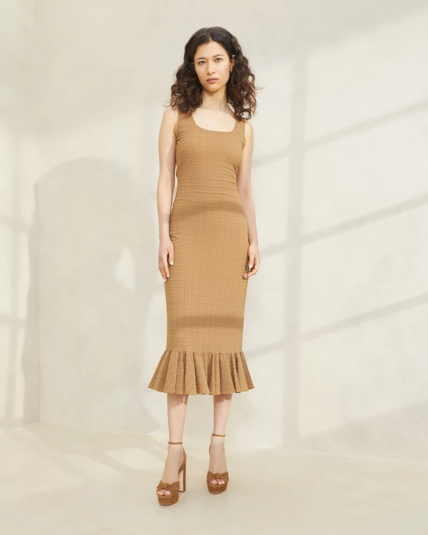 Sleeveless mid-length dress in beautiful brown puckered fabric. Features a square neckline and a ruffled hem. Yessica’s stretchy fabric imparts a fitted yet comfortable shape. Unlined.