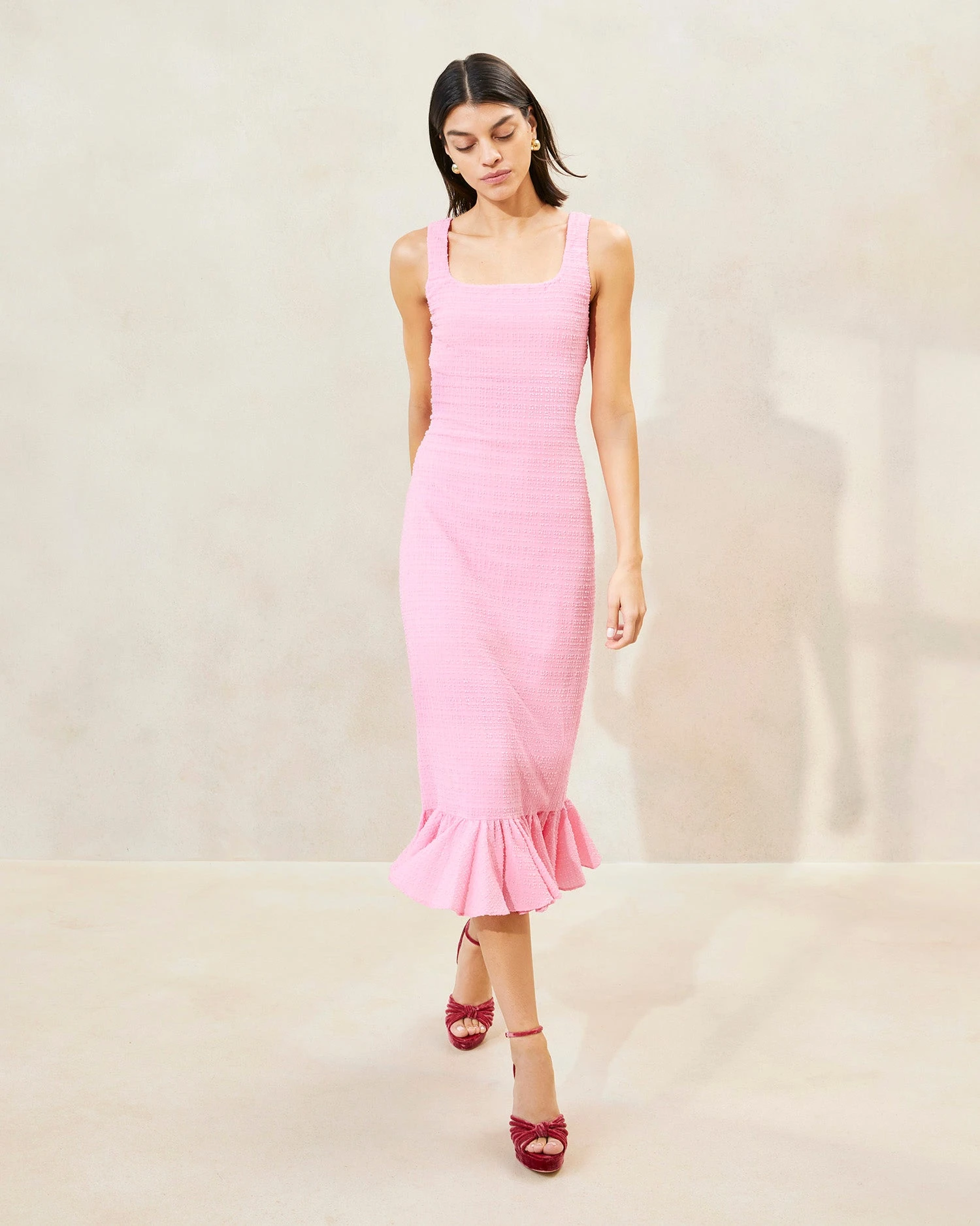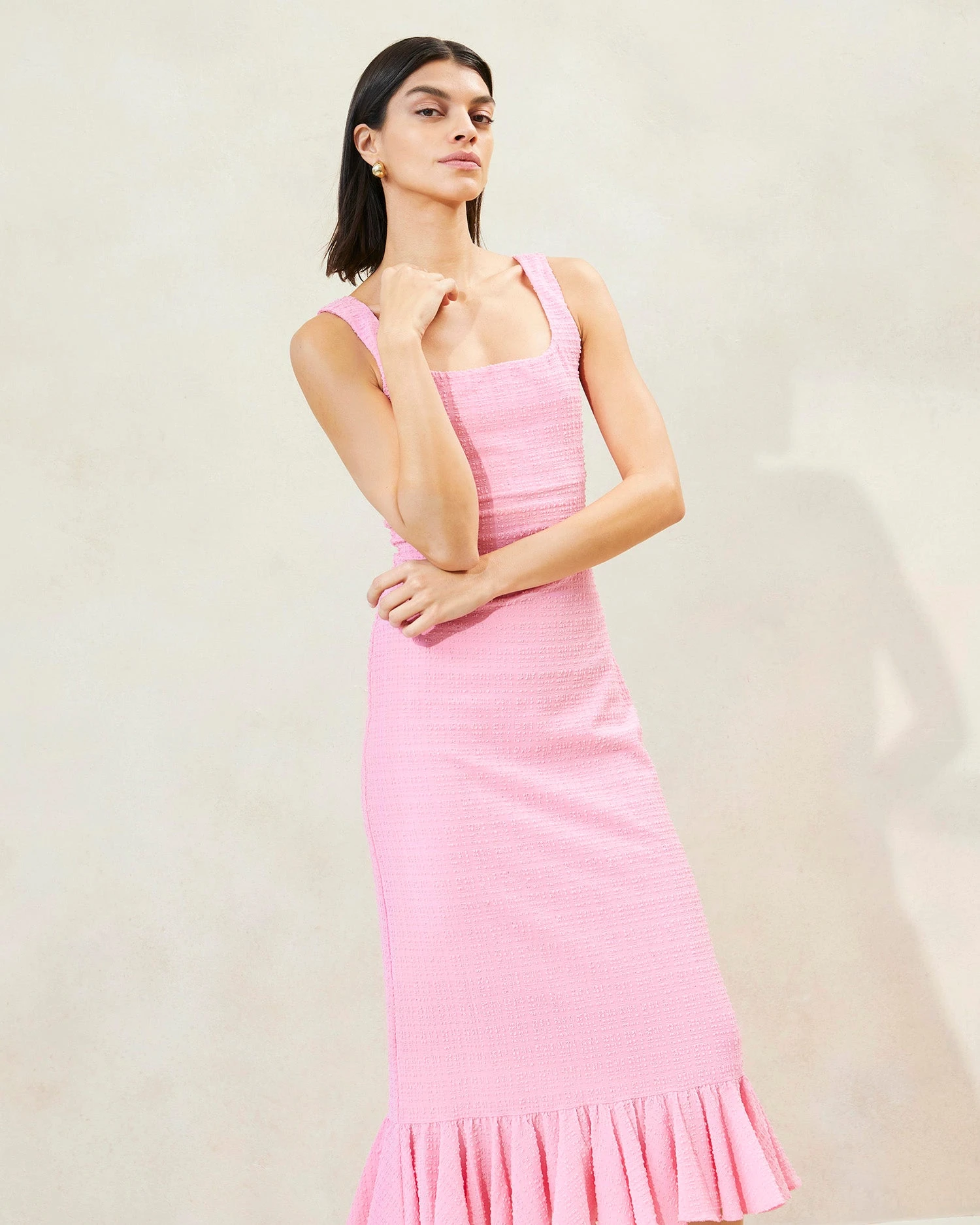 Sleeveless mid-length dress in pink French seersucker. Features a square neckline and a ruffled hem. Yessica’s stretchy fabric imparts a fitted yet comfortable shape. Unlined.