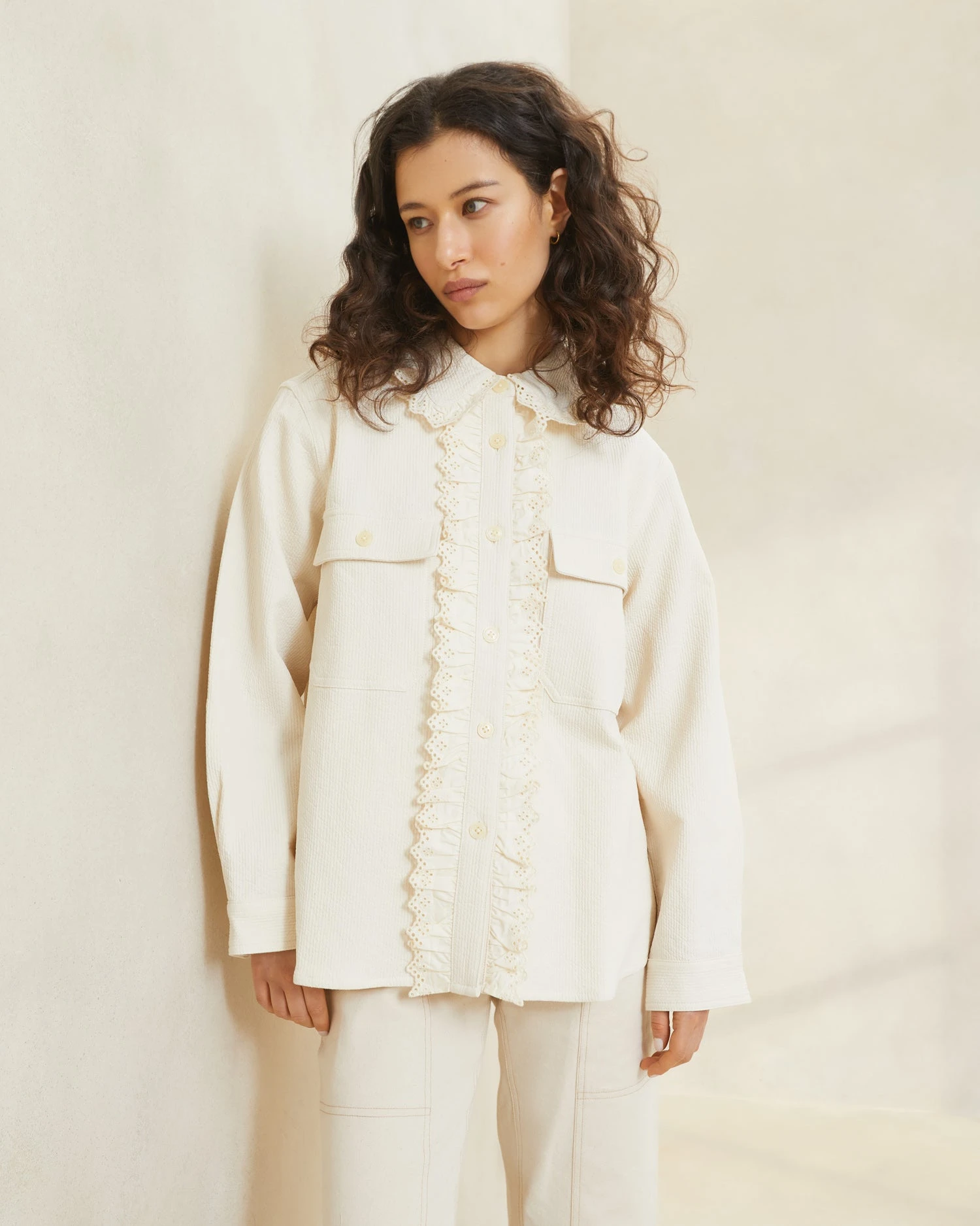 Button down lightweight jacket in ecru cotton with eyelet trim. Features two pockets.